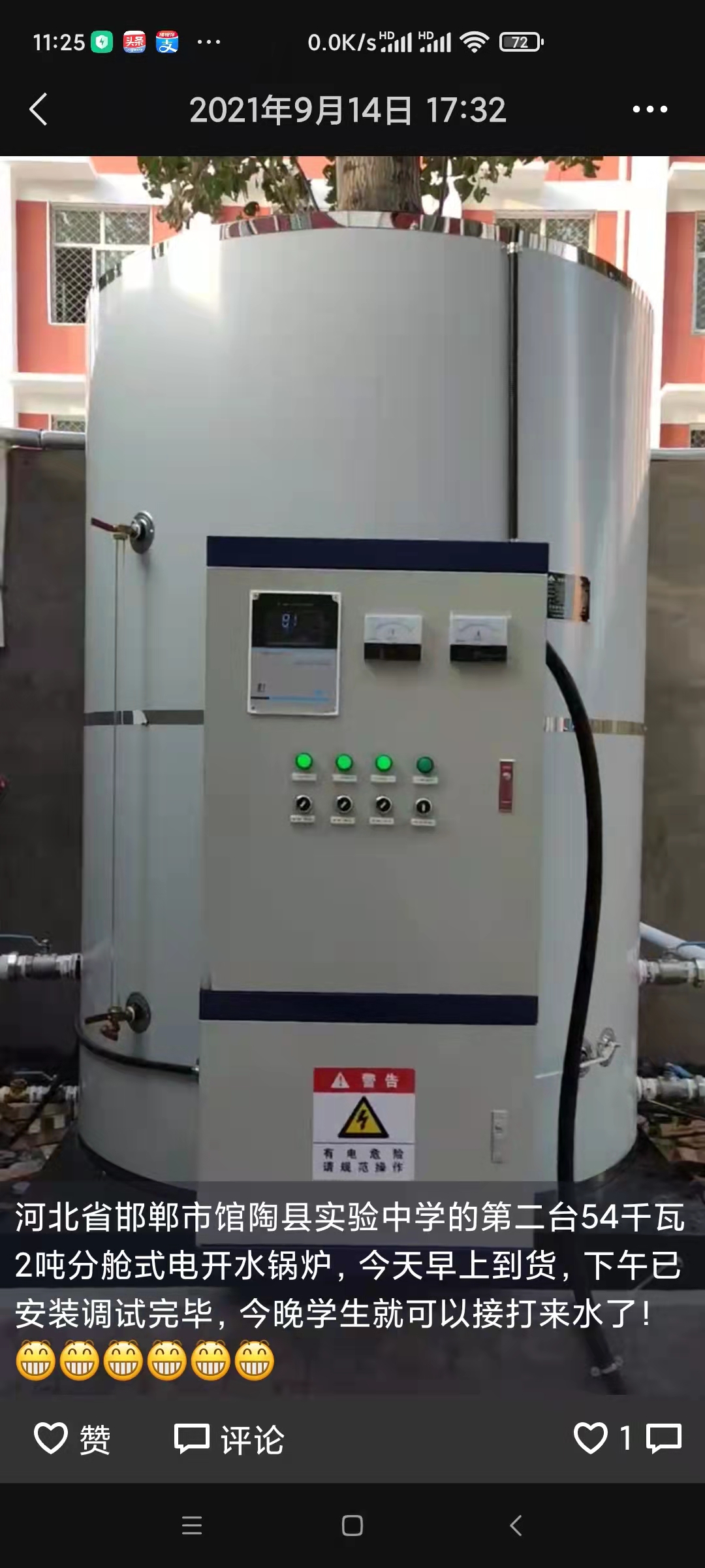 館陶縣實(shí)驗(yàn)中學(xué)就是原來的館陶縣第二中學(xué),位于邯鄲市館陶縣文衛(wèi)街089號(hào),2021年8月份訂購兩臺(tái)54千瓦兩噸電開水爐,分別于2021年8月29日和9月14日安裝調(diào)試完畢,交付校方使用!